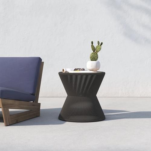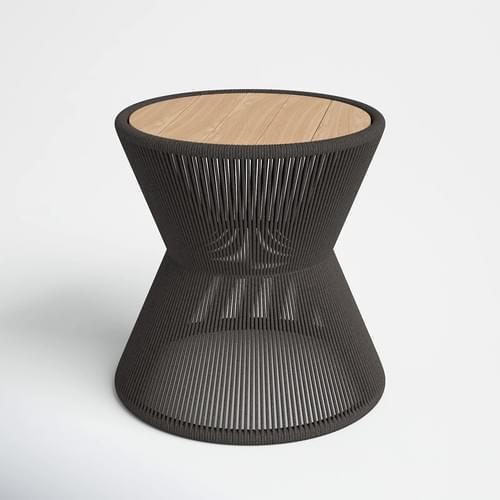 Infuse your patio with modern boho style. This outdoor side table combines natural textures for an organic look. Its round tabletop is crafted with solid teakwood in a natural finish that highlights the wood's grain. The outer frame adds visual and textural contrast with all-around rope detailing in an espresso hue. This side table is sized right for pairing with a patio sofa or lounge chair. Best of all, it's resistant to water, UV rays, mildew, and rust. No assembly required.